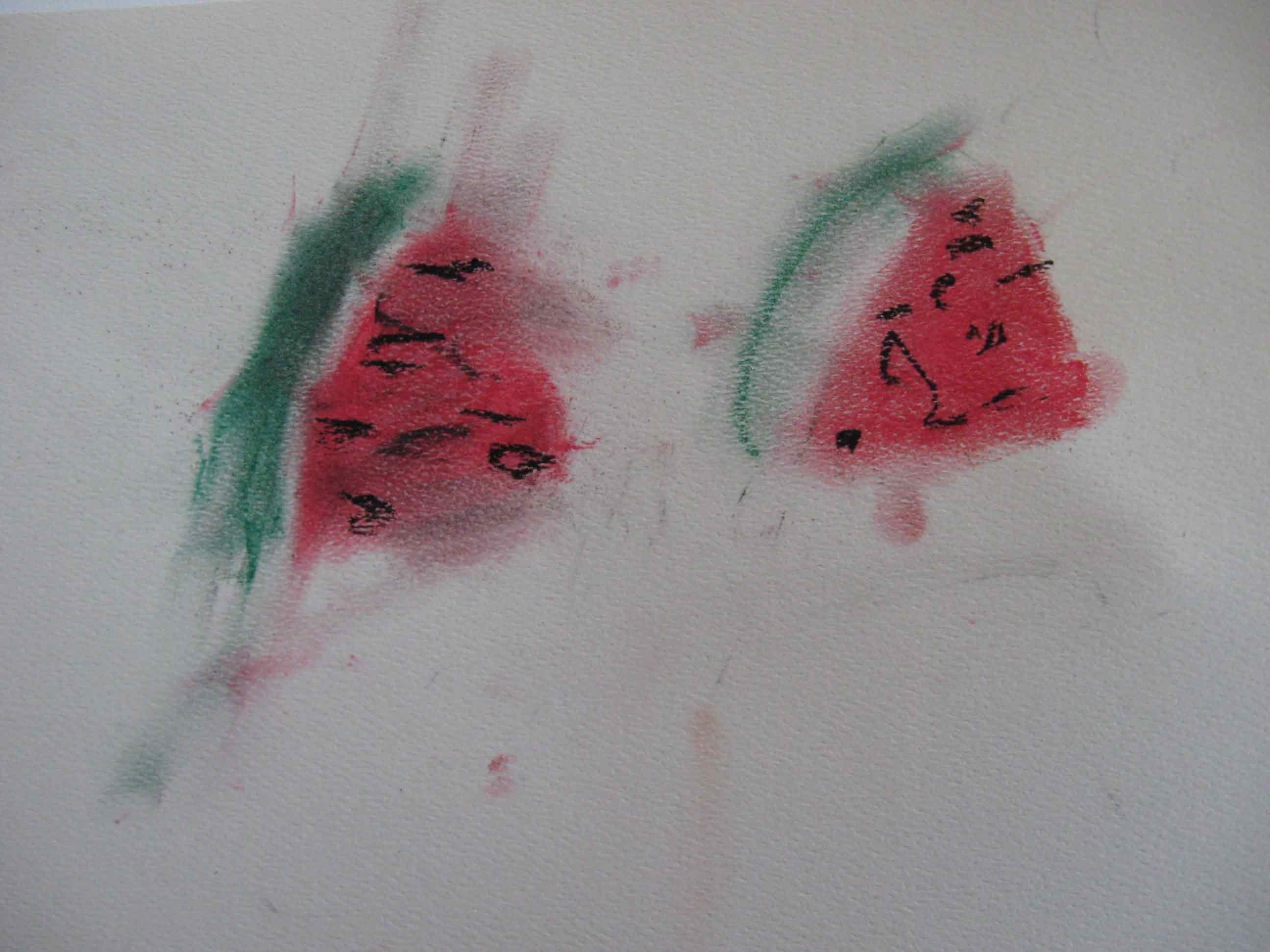 Abby (2) had to have a turn with the pastels with my careful supervision. Her watermelon slices turned out nice!