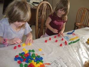 We have done lots of math with cooking. Here they are making Monkey Bread. My kids have learned about fractions from measuring ingredients. At least, they know how to read a fraction and have a pretty good idea of what fractions are.